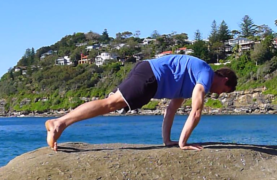 Start/Finish Position – Cat stretch plank: Spine is flexed (rounded), 80-90% of your bodyweight is distributed through your hands, arms are straight and you are pushing your chest away from the floor. (same as the ‘pop-up push halfway position’ except lungs are full)
